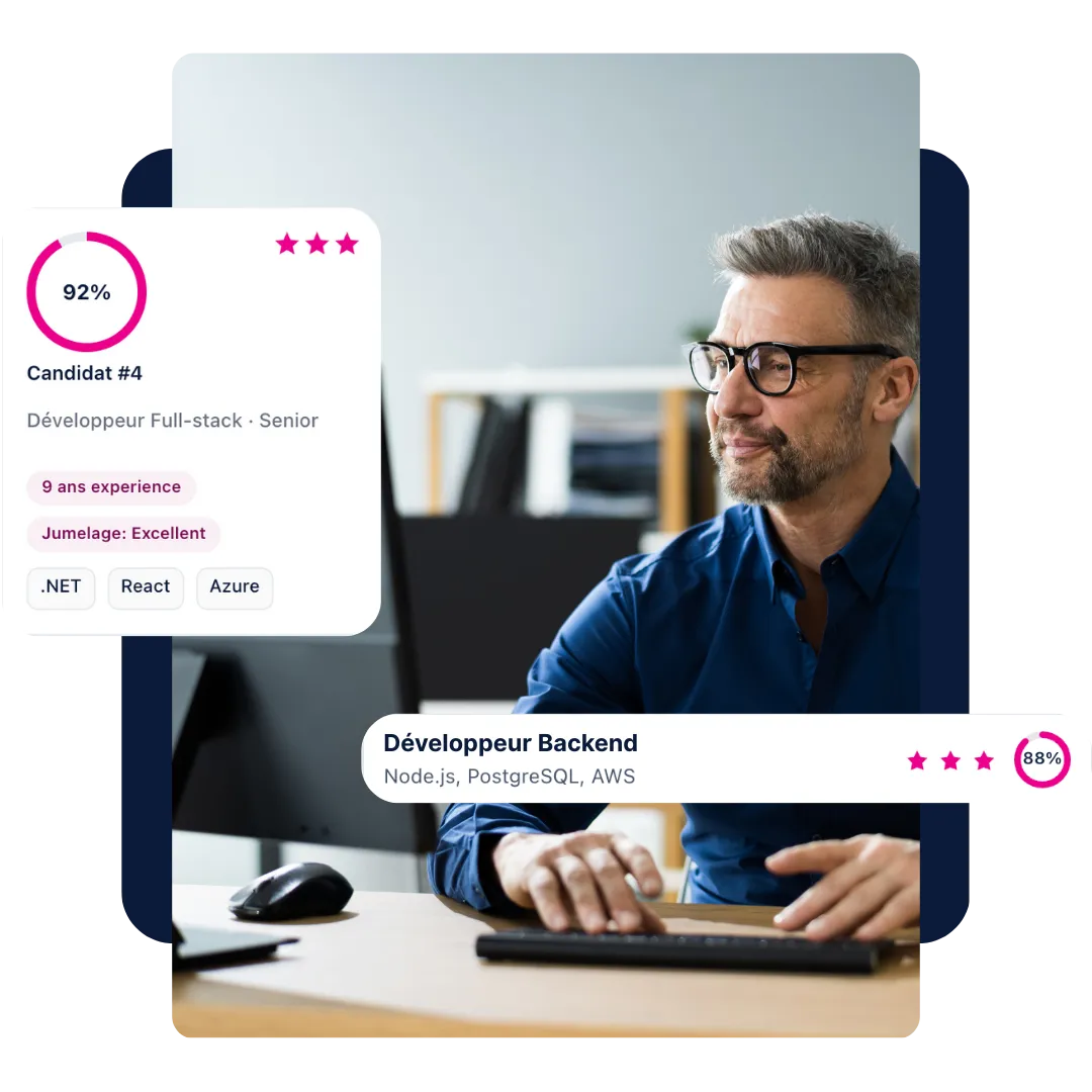 Notre algorithme présente les meilleurs candidats avec un score de compatibilité.